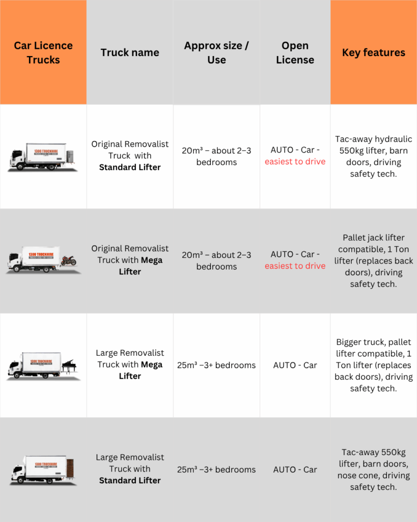 1300Truckhire has 3 different car licence trucks to choose from. All of our car licence trucks come with ropes, trolly and blankets to assist you with your move. If you have any questions, please do not hesitate to Contact 1300 Truck Hire.